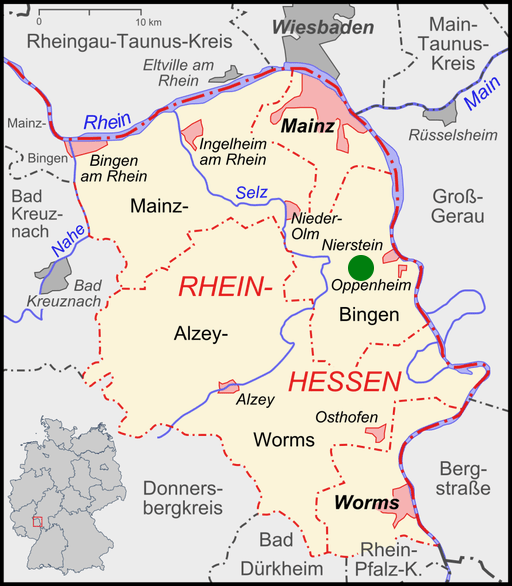 Abenheim, Albig, Alsheim, Alzey, Amöneburg, Appenheim, Armsheim, Aspisheim, Badenheim, Bechenheim, Bechtheim, Bechtolsheim, Bermersheim, Bermersheim (Höhe), Biebelnheim, Biebelsheim, Bingen, Bingerbrück, Blödesheim, Bodenheim, Bornheim, Bretzenheim, Bubenheim, Budenheim, Büdesheim, Dalheim, Dalsheim, Dautenheim, Dexheim, Dienheim, Dietersheim, Dintesheim, Dittelsheim, Dittelsheim-Heßloch, Dolgesheim, Dorn-Dürkheim, Drais, Dromersheim, Ebersheim, Eckelsheim, Eich, Eichloch, Eimsheim, Elsheim, Engelstadt, Ensheim, Enzheim, Eppelsheim, Erbes-Büdesheim, Esselborn, Essenheim, Finthen, Flomborn, Flonheim, Flörsheim-Dalsheim, Framersheim, Frei-Laubersheim, Frei-Weinheim, Freimersheim, Frettenheim, Friesenheim, Fürfeld, Gabsheim, Gau-Algesheim, Gau-Bickelheim, Gau-Bischofsheim, Gau-Heppenheim, Gau-Köngernheim, Gau-Odernheim, Gau-Weinheim, Gaulsheim, Gensingen, Gimbsheim, Gonsenheim, Grolsheim, Großwinternheim, Gumbsheim, Gundersheim, Gundheim, Guntersblum, Hackenheim, Hahnheim, Hamm, Hangen-Wahlheim, Hangen-Weisheim, Harxheim, Hechtsheim, Heden(e)sheim, Heidenfahrt, Heidesheim, Heimersheim, Heppenheim, Herrnsheim, Heßloch, Hillesheim, Hochborn, Hochheim, Hof-Iben, Hohen-Sülzen, Horchheim, Horrweiler, Ibersheim, Ingelheim, Ippesheim, Jugenheim, Kastel, Kempten, Kettenheim, Klein-Winternheim, Köngernheim, Kostheim, Kriegsheim, Laubenheim, Laurenziberg, Leiselheim, Lerchenberg, Lonsheim, Lörzweiler, Ludwigshöhe, Mainz, Marienborn, Mauchenheim, Megelsheim, Mettenheim, Mölsheim, Mombach, Mommenheim, Monsheim, Monzernheim, Mörstadt, Nack, Nackenheim, Neu-Bamberg, Neuhausen, Nieder-Flörsheim, Nieder-Hilbersheim, Nieder-Ingelheim, Nieder-Olm, Nieder-Saulheim, Nieder-Wiesen, , Nierstein, Ober-Flörsheim, Ober-Hilbersheim, Ober-Ingelheim, Ober-Olm, Ober-Saulheim, Ockenheim, Offenheim, Offstein, Oppenheim, Osthofen, Partenheim, Pfaffen-Schwabenheim, Pfeddersheim, Pfiffligheim, Pleitersheim, Rheindürkheim, Rommersheim (Wö), Rudelsheim, Rummersheim, Sandhof (Eich), Sandhof (Heidesheim), Sankt Johann, Saulheim, Schafhausen, Schornsheim, Schwabenheim, Schwabsburg, Selzen, Siefersheim, Sörgenloch, Spiesheim, Sponsheim, Sporkenheim, Sprendlingen, St. Johann, Stadecken, Stadecken-Elsheim, Stein-Bockenheim, Sulzheim, Tiefenthal (Rheinhessen), Udenheim, Uelversheim, Uffhofen, Uhlerborn, Undenheim, Vendersheim, Volxheim, Wachenheim im Zellertal, Wackernheim, Wahlheim, Wallertheim, Walsheim, Weinheim, Weinolsheim, Weinsheim, Weisenau, Welgesheim, Wendelsheim, Westhofen, Wiesoppenheim, Wintersheim, Wolfsheim, Wöllstein, Wonsheim, Worms, Wörrstadt, Zahlbach, Zornheim, Zotzenheim